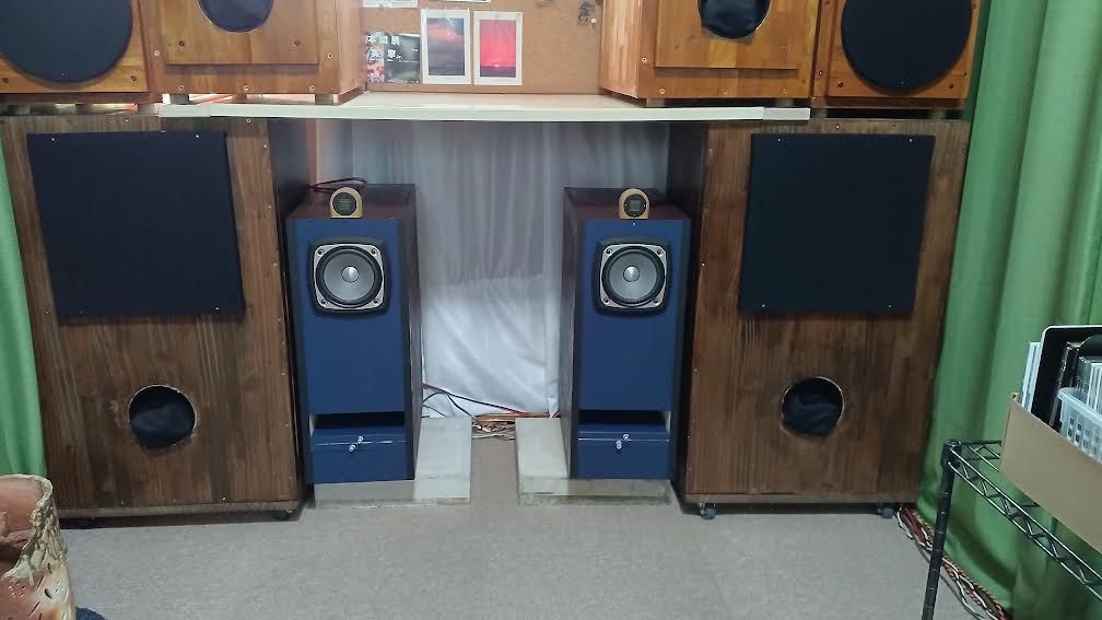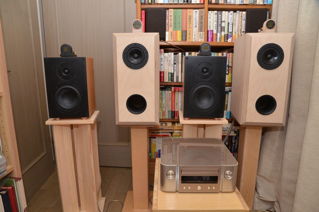 写真は左側のみですが、ここ2年ばかり安達(大山)氏のメルマガのお話しの流れのまま自作だましいが起きて製作した品々を机サイドに置いてみました。右側もほとんど同じ形で窓側に置いています。Z600CannonBall100のように入れ物のみ作り手持ちSPからいろいろメルマガにヒント得て今はT250D付けてZ506Livorno1とで良結果のものもあります。ところでZ703-FF125WKは単体でもまとまったいい音ですがいまは下の床に置いて中低音用にネットワーク入れて使っています。Lメーターを持っているのでメルマガ参考にLCRでネットワーク作るのも面白いです。更に磁石や開口部調整をと思いますが未だ手が届きませんが非常に自作ごころを考えた箱とユニットと思います。ところで写真上部のものスイッチで切り換えますといずれも甲乙感じられないいい音を出しさすがと思います。使用アンプはエントリーものでDENON AVR-X580BT、FOSI M04 PANASONIC BDプレーヤー パソコンオーディオです。Sウーハーは都合でDaytonAudioのDC250-8エントリーモデルでガマンしましたがそれでも家内からはなれてもひびく低音はやめてくれとクレームです。