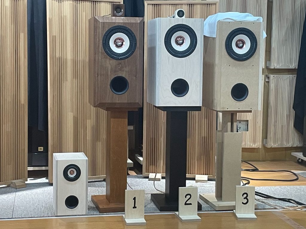 同軸16㎝のユニットを使った2種類(1と2)と、16㎝ウーファーとツイーター構成の2ウェイ(見た目はZ800-FW168HRのよう)の2種類(3と4)で計4種類を試聴しました。